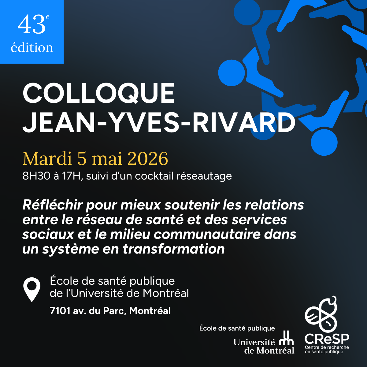 La 43e édition du Colloque Jean-Yves-Rivard, organisée en partenariat avec le Centre de recherche en santé publique (CReSP), réunira des acteurs communautaires, décisionnels, professionnels et scientifiques afin de discuter de ces enjeux et de réfléchir ensemble aux leviers permettant de renforcer des partenariats durables, équitables et mutuellement bénéfiques entre le secteur communautaire et le RSSS.
