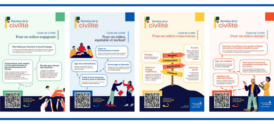 En parallèle, la campagne d’affichage amorcée en 2024 sera reconduite. Les quatre affiches thématiques — Pour un milieu engageant, Pour un milieu équitable et inclusif, Pour un milieu intègre et Pour un milieu respectueux — seront de nouveau exposées dans les couloirs de l’École, rappelant les principes qui guident la vie communautaire à l’ESPUM.